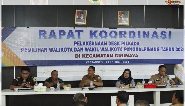 Rapat Koordinasi Pelaksanaan Desk Pilkada Pemilihan Walikota dan Wakil Walikota Tahun 2024 di Kecamatan Girimaya Pgk yang diselenggarakan oleh Badan Kesbangpol Pangkalpinang , dengan maksud mensukseskan pelaksanana pilkada melalui upaya meningkatkan partisipasi masyarakat, menjaga suasana yang kondusif dan Netralitas ASN dalam pelaksanaan pilkada.